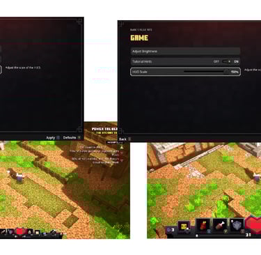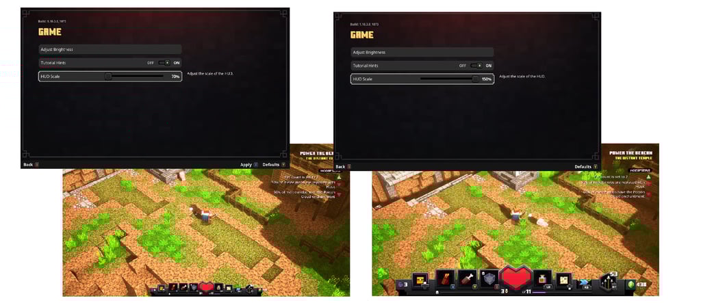 Minecraft Dungeons shows a comparison between the heads-up display scaled to 70% versus the heads-up display scaled to 150%.)