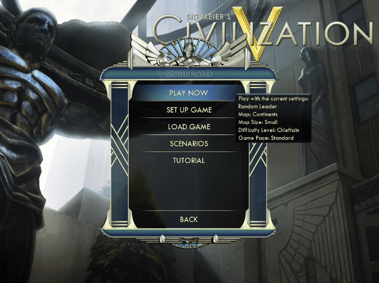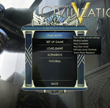 Civilisation 5 quick start option, allowing a game to be started without navigating any configuration screens