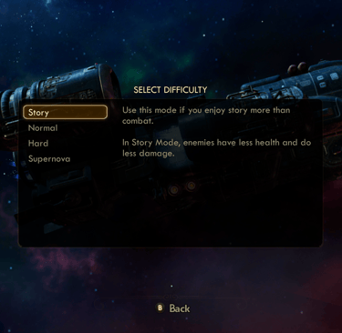 The Outer Worlds Select Difficulty menu, players can choose between Story, Normal, Hard, and Supernova. Each difficulty level provides a detailed description of what players can expect in terms of enemy health, damage, and other aspects of gameplay that contribute to difficulty
