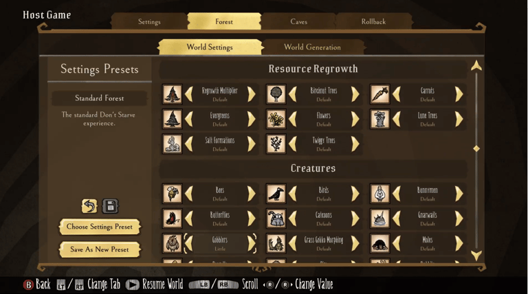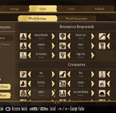 The survival game Don't Starve, for example, imposes challenges related to gathering food and resources, protecting characters from dangerous weather, and staying safe from enemies. In the following image of the Don't Starve Together World Generation customization menu, players can customize:
