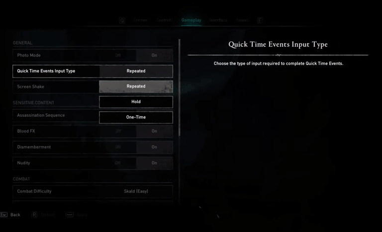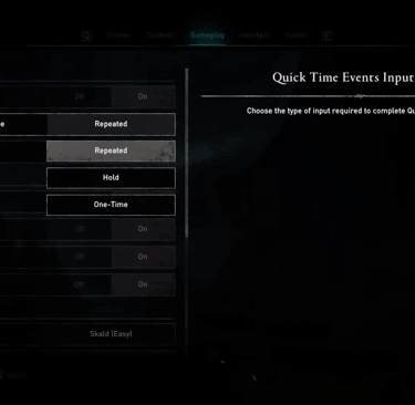 Assassin's Creed Valhalla game, players can choose between a one-time press, a hold, or repeated presses for QTEs. Another option has been added to bypass QTEs entirely in some boss encounters.