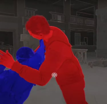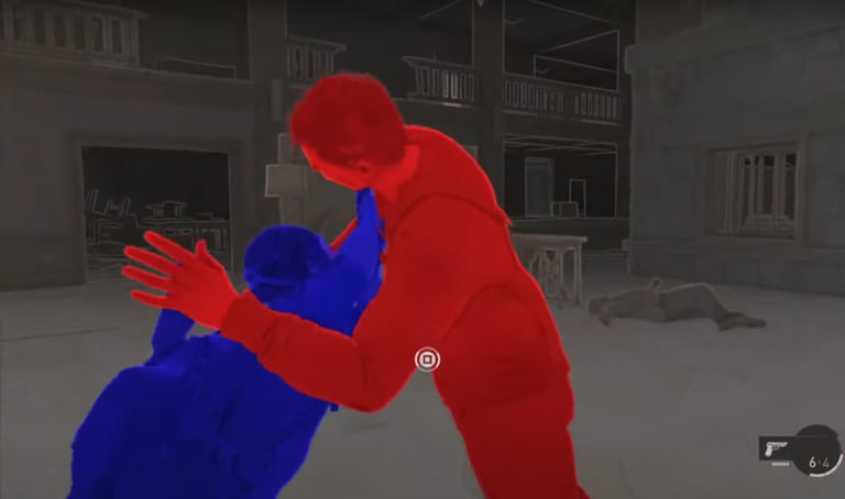 In "The Last of Us Part II", this mode might render the environment in muted tones while characters, enemies, and key items are highlighted in bright colors. Allies might be highlighted in one color (like blue), enemies in another (such as red), and objects of interest (like items or interactive elements) in yet another distinct color.