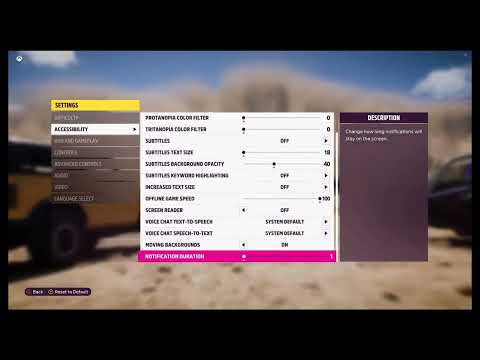 Forza Horizon 5 accessibility settings menu. Players can enable and disable background movement while they navigate their menu settings.