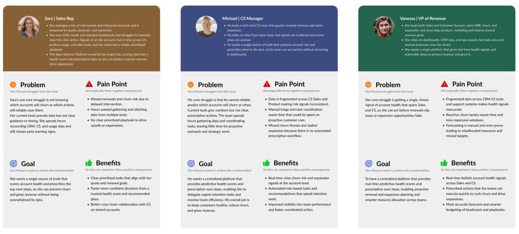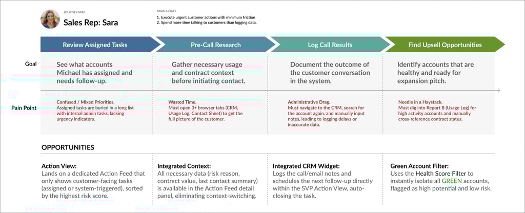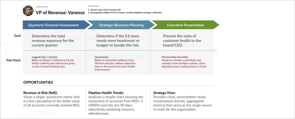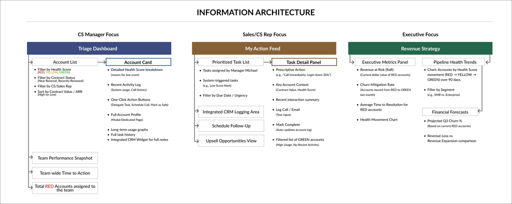 This mapping resulted in a three-tiered IA: Triage (Michael) → Action (Sara) → Strategy (Vanessa).