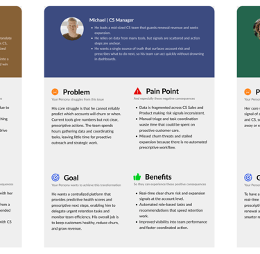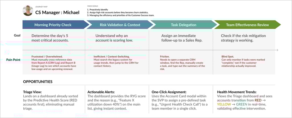 CS Manager Michael: Needs a high-level view of account health to triage risk for his entire team.