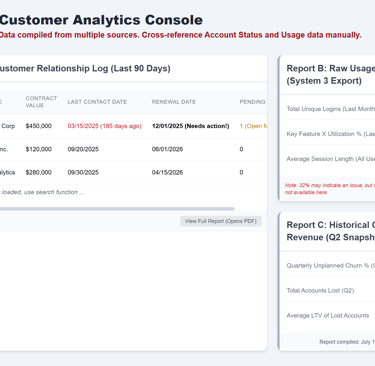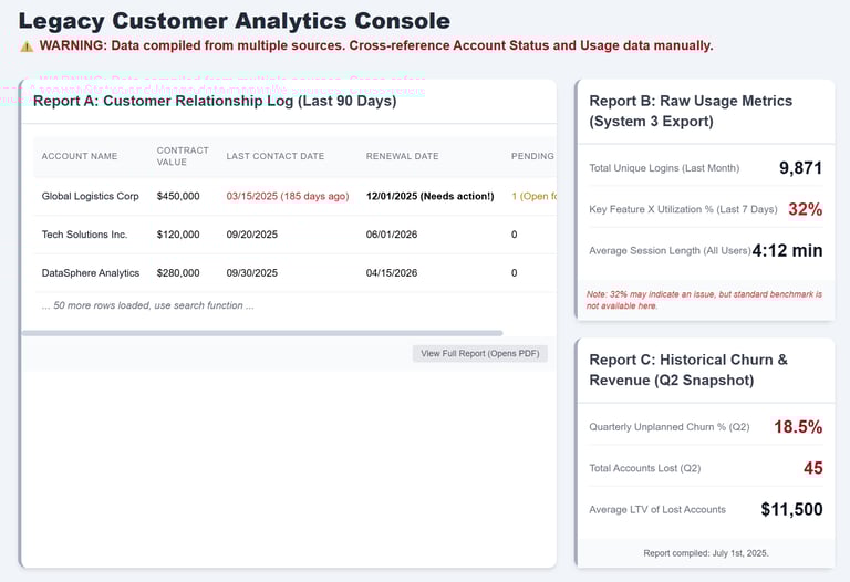 The client—a B2B SaaS provider—suffered from a fundamentally reactive Customer Success (CS) model. Their current analytics solution was a collection of disparate reports that provided historical data but offered no predictive indicators or prescriptive actions.