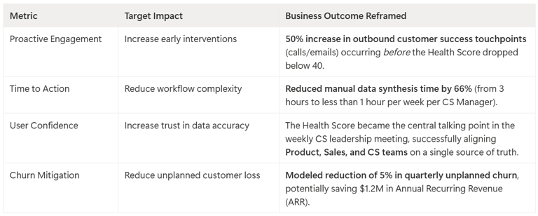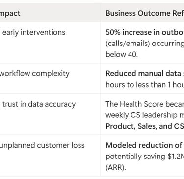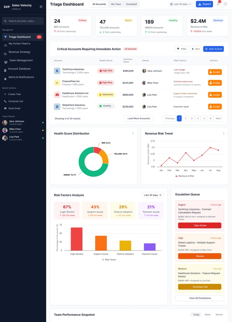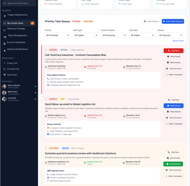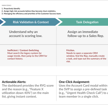 Actionable Alerts: Rather than just showing a chart, the system provided prescriptive actions (e.g., "Call Account X: Renewal in 30 days, Login inactive for 5 days").