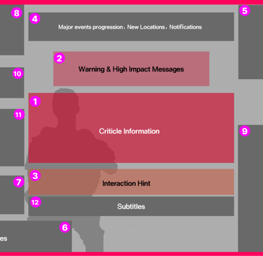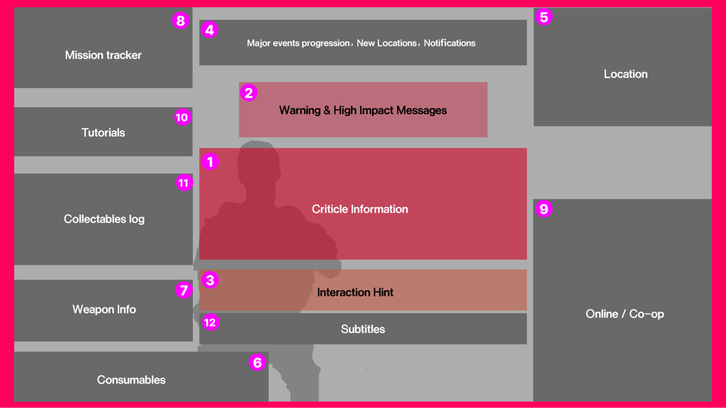 Center of Screen → Reserved for life-and-death critical info (e.g., reticle, reload status, damage indicators).